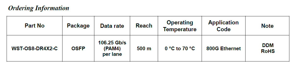 The WST-OS8-DR4X2-C module is an 800G optical transceiver designed for single-mode fiber (SMF) transmission. It provides eight electrical lanes operating at 106.25 Gb/s PAM4 signaling and supports a 2xDR4 optical interface for transmission distances up to 500 m over SMF. The module is implemented in an OSFP form factor and utilizes an MPO-12/ APC connector for optical connectivity. The optical engine is based on silicon photonics (SiPh) technology, incorporating a PIC (photonic integrated circuit) to perform high-speed optical modulation and signal routing. External laser sources are coupled into the SiPh PIC, while photodetectors are implemented using discrete components for optical signal detection. A multi-lane architecture is employed to enable high-density integration and efficient high-speed optical transmission. The module integrates a DSP-based electrical interface to support PAM4 signal processing and ensure reliable high-speed data transmission. It is intended for 800G Ethernet and Datacom applications.
