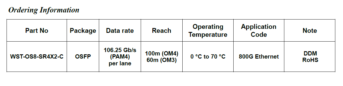 The WST-OS8-SR4X2-C module is an 800 Gb/s OSFP-800 optical transceiver designed for short-reach multimode fiber (MMF) transmission. It provides eight electrical lanes operating at 106.25 Gb/s PAM4 signaling and supports a 2xSR4 optical interface for transmission distances up to 100 m over OM4 multimode fiber. The module integrates optical and electrical components within an OSFP-800 form factor and uses dual MPO-12/APC connectors for optical connectivity. The optical transmitters are based on 850 nm VCSEL technology and the receivers use PIN photodiodes, optimized for short-reach multimode fiber applications.