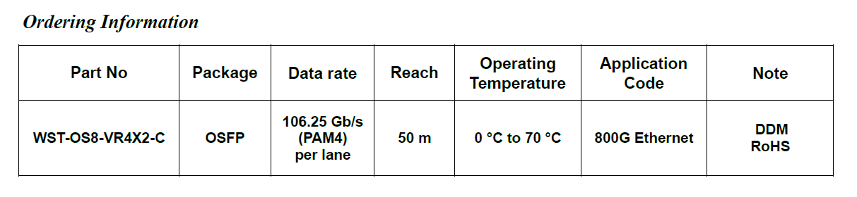 The WST-OS8-VR4X2-C module is an 800Gb/s OSFP-800 optical transceiver designed for short-reach multimode fiber (MMF) transmission. It provides eight electrical lanes operating at 106.25 Gb/s PAM4 signaling and supports a 2×VR4 optical interface for transmission distances up to 50 m over OM4 multimode fiber. The module integrates optical and electrical components within an OSFP-800 form factor and uses dual MPO-12/APC connectors for optical connectivity. The optical transmitters are based on 850 nm VCSEL technology and the receivers use PIN photodiodes, optimized for short-reach multimode fiber applications.