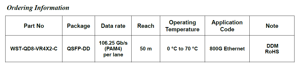 - 2xVR4 (50 m) optical interface over OM4 multimode fiber with host-side KP4 FEC